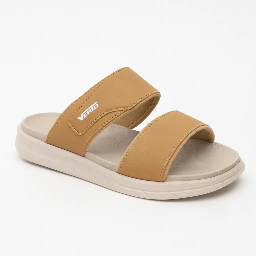 These tan slide sandals are designed for everyday use. The broad double straps keep your feet steady while still letting them breathe. The cushioned footbed gives support with each step, and the lightweight sole makes them practical to wear all day, whether indoors or outside.
