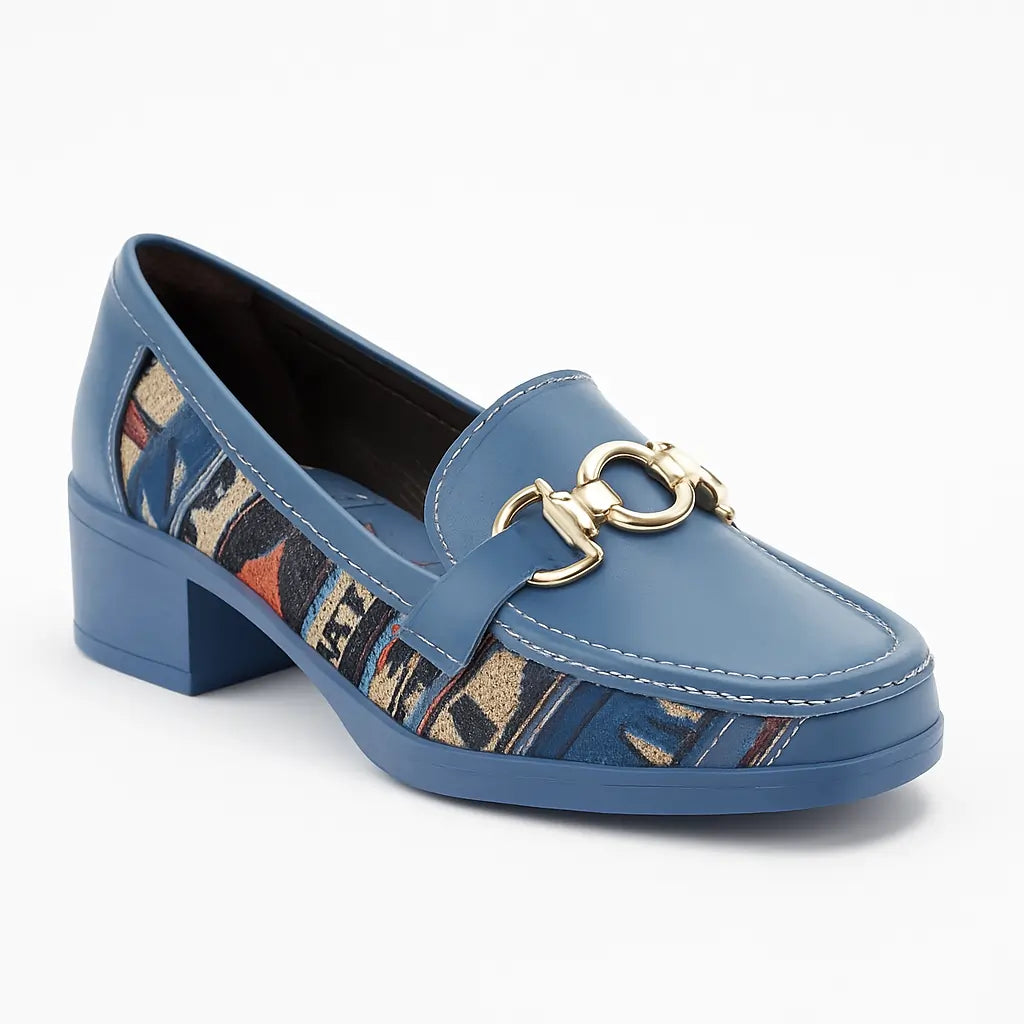 The smooth blue upper pairs with patterned side panels, giving a look that is unique yet still easy to match. The gold buckle detail adds a classic touch, making them suitable for both work and casual outings.