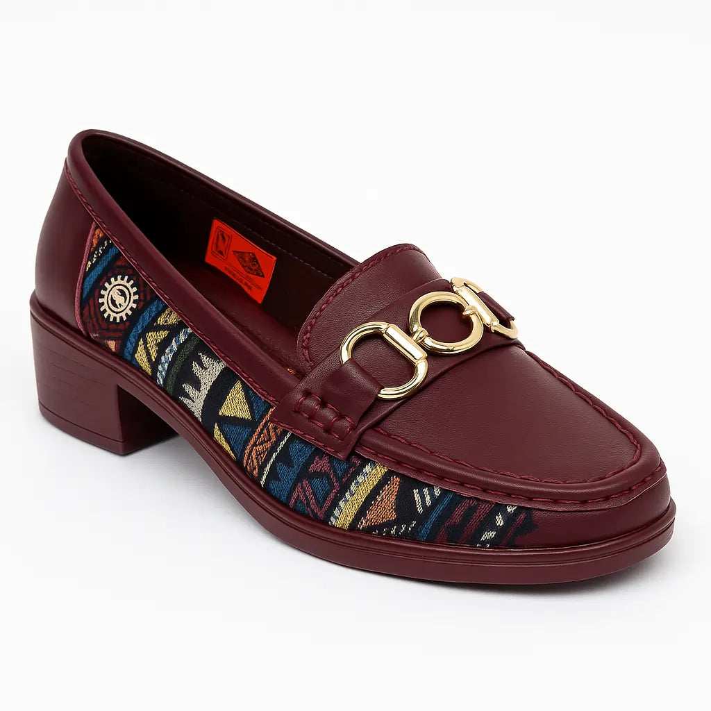 The deep maroon color pairs with patterned side panels to create a style that is unique but still versatile. The gold buckle detail adds a classic finish, giving the shoe a touch of polish that works for both casual and formal settings.
